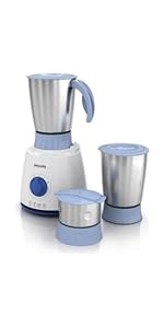 The Philips Mixer Grinder includes an automatic shut-off button, and the entire set includes a mixer and grinder, chutney jar, wet grinding jar, multipurpose jar, spatula, an instruction manual, and a warranty card. This mixer grinder has special blades that lift the food, and grind it at the same time, to create a fine blend of its contents destroying lumps. The bottom of the grinder has an anti-slip base, which uses vacuum suction to keep the grinder in place while it is in use.